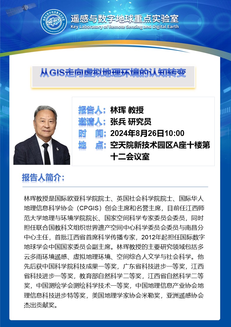 林珲教授是国际欧亚科学院院士、英国社会科学院院士、国际华人地理信息科学协会(CPGIS)创会主席和名誉主席,目前任江西师范大学地理与环境学院院长、国家空间科学专家委员会委员,同时担任联合国教科文组织世界遗产空间中心科学委员会委员与南昌分中心主任,首批江西省首席科学传播专家,2012年起担任国际数字地球学会中国国家委员会副主席。林珲教授的主要研究领域包括多云多雨环境遥感、虚拟地理环境、空间综合人文学与社会科学。他先后获中国科学院科技成果一等奖,广东省科技进步一等奖,江西省科技进步一等奖,教育部自然科学二等奖,江西省自然科学二等奖,中国测绘学会测绘科学技术一等奖,中国地理信息产业协会地理信息科技进步特等奖,美国地理学家协会米勒奖,亚洲遥感协会杰出贡献奖。