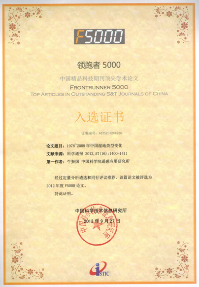 牛振国研究员等作者于2012年在《科学通报》第16期发表的论文“1978~2008年中国湿地类型变化”入选了2012年度F5000优秀论文。