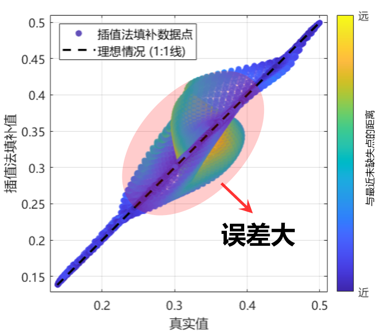 ·插值法在数据缺失程度低的局部区域填补效果较好,但当数据连续大范围缺失时,填补的不确定性显著增加(图1)。