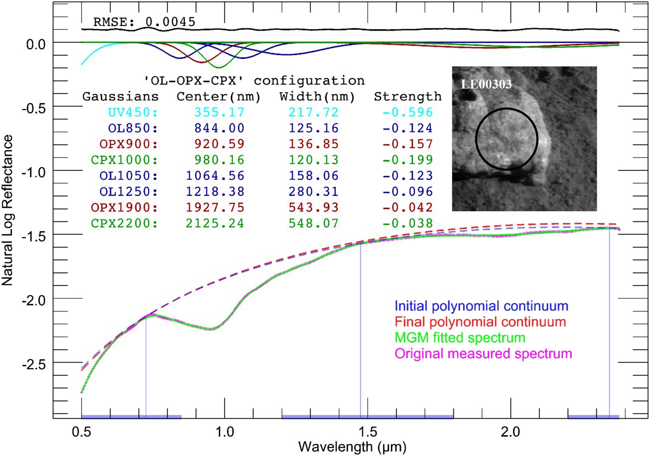 利用玉兔二号就位测量的光谱进一步分析嫦娥四号着陆区矿物成分,光谱拟合结果表明着陆区月壤含有富镁橄榄石和富镁斜方辉石矿物,二者相对含量基本相等。根据镁铁质矿物成分和芬森撞击坑空间位置,进一步分析认为着陆区月壤可能源自南极艾肯盆地撞击事件形成的撞击熔融分异物或一套富镁岩石。相关成果2020年发表于Icarus。
