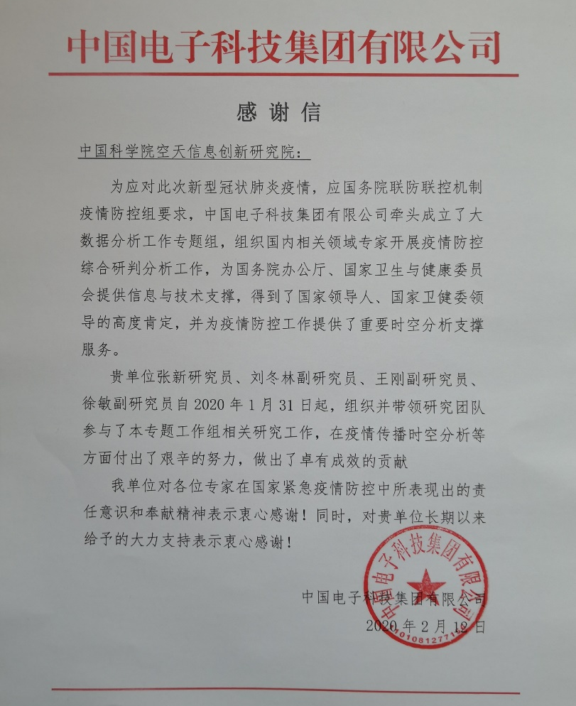 实验室中科院空天信息创新研究院分部参加中国电子科技集团有限公司牵头的疫情防控综合研判大数据分析工作组,代表空天信息创新研究院作为空间模型分析组的牵头单位,由实验室张新研究员组织和联合了我院的徐敏副研究员、刘冬林副研究员、王刚副研究员、程博研究员、陈甫副研究员等科研人员,协同中科院地理所、南京大学、北京联合大学、数字中国研究院等11家单位的40多位专家,承担了时空大数据分析、遥感监测等工作。综合应用多家部委提供的全国确诊、疑似病例、密切接触者、外来流入人口、遥感监测等数据,开展全国疫情传播的时空特性、医治效率的区域差异特征、全国县域疫情风险分级、空间传播链计算、重点城市群复工复产遥感监测等工作。形成34个省级行政区域、294个地级市、2846区县三级分级疫情风险评价图,作为国家卫生与健康委员会全国分级的重要依据,服务于全国各地的分级管控。相关成果为国务院办公厅、国家卫生与健康委员会提供了疫情研判信息与技术支撑,得到了国家领导人、国家卫生与健康委员会领导的高度肯定。