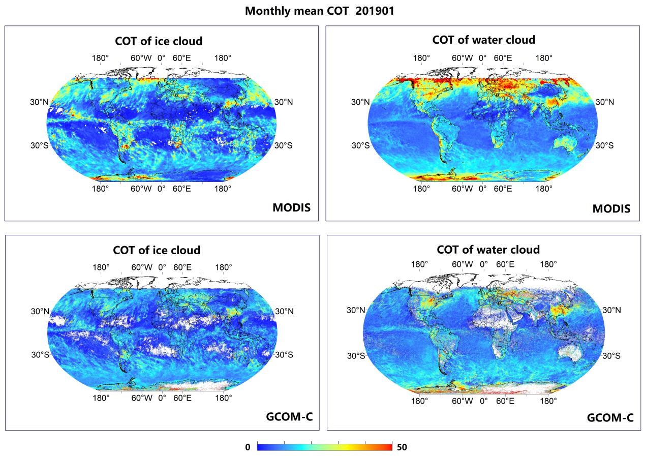 图2: 2019年1月GCOM-C卫星冰云和水云光学厚度(COT)产品