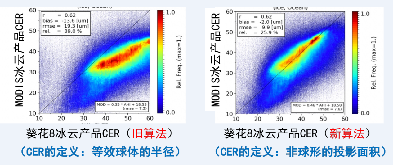 葵花-8卫星的官方系列冰云产品由空天信息研究院胡斯勒图研究员负责开发。其在研发的典型冰晶粒子光散射属性数据库(Letu et al., 2012)基础上,提出从不同形状的冰晶模型中选择最有代表性的散射模型来反演冰云微物理参数的方法,并利用POLDER多角度遥感数据证实选择代表性冰晶模型的有效性。提出的新非球形冰晶模型(Voronoi模型)被证实能够有效反演全球尺度的冰云微物理参数(Letu et al., 2016)。进而利用Voronoi冰晶散射模型,结合辐射传输原理开发葵花-8卫星官方冰云算法(图1),分析强对流过程中云微物理参数及降水量的时空变化特征,证实葵花-8卫星资料具有估算云降水量的能力。在新版本中,云微物理参数反演算法获得进一步更新,即对冰云粒子有效半径的定义进行了修正。从同MODIS产品的比较来看,相较Beta版本(图2左),新公布的产品(图2右)有了明显的改进。