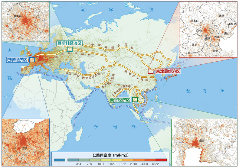 该团队参与了《全球生态环境遥感监测2016年度报告》编写工作,针对“一带一路”互联互通热点问题,聚焦“‘一带一路’陆路交通与重点经济区生态环境状况”专题开展监测分析。基于多源、多时空尺度空间信息数据,生成2016年度“一带一路”沿线90多个国家/地区和“六大经济走廊”区域的路网密度、道路通行能力指数、土地利用、城市热岛、灯光指数等数据产品,围绕道路通达性及其对景观格局的影响、城市区域发展和生态环境状况开展评估分析。成果独立客观地反映了“一带一路”监测区域不同国家/地区的公路和铁路交通通行能力以及17个重要城市群的发展和生态环境状况,可为“一带一路”互联互通倡议的实施提供数据支持和信息支撑。