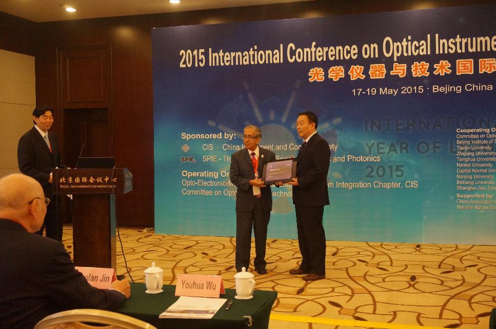 5月18日,在光学仪器与技术国际学术研讨会开幕式上,国际光学工程学会(SPIE)的代表Daniel Malacara教授向遥感科学国家重点实验室主任施建成研究员颁发了SPIE Fellow奖章,以表彰其在光学、光电子以及图像处理等领域取得的杰出成就。