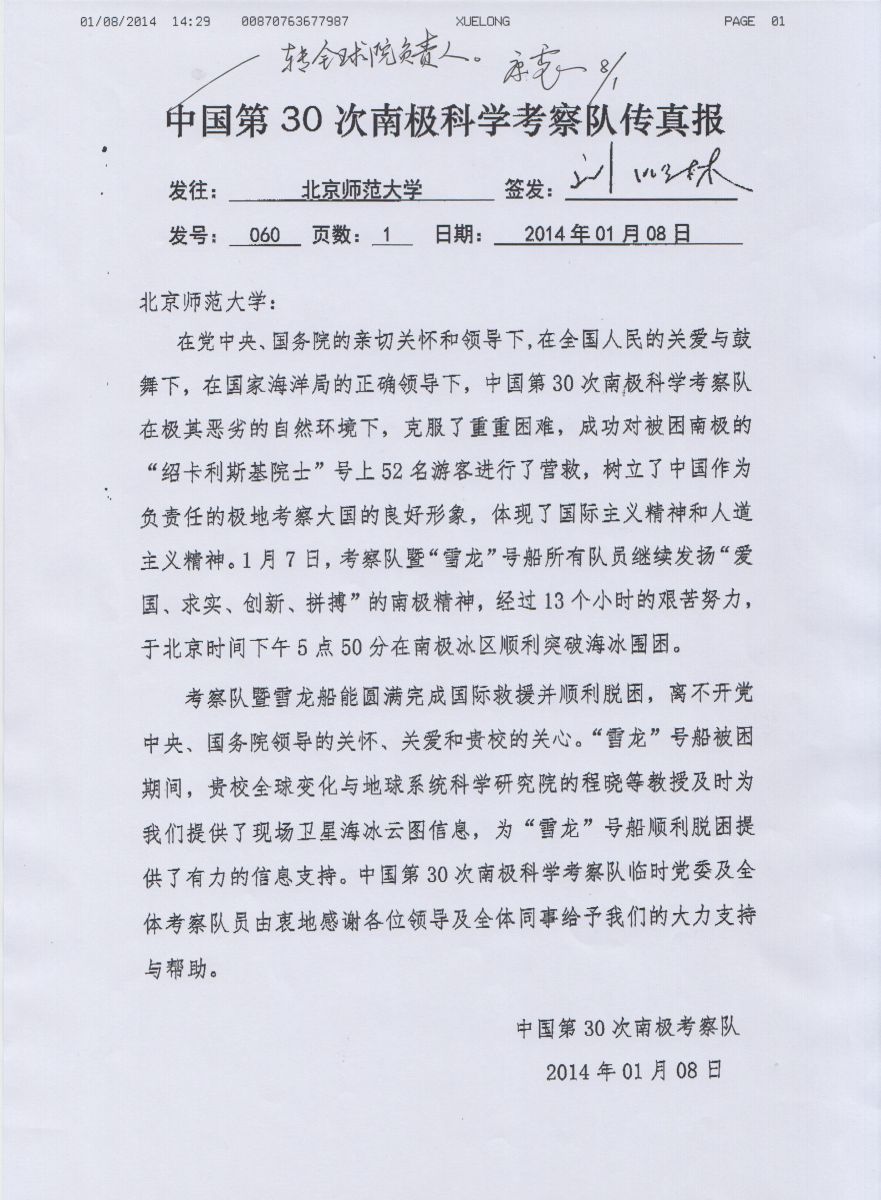 自中国南极考察队科考船“雪龙”号被困冰区后,我室“极地遥感团队”(隶属于北京师范大学全球变化与地球系统科学研究院)全力协助其脱困,于1月7日为“雪龙”号提出科学的撤离方案,使其仅用1个小时即驶入清水区,成功脱困。1月8日,中国第30次南极考察队向我校发来感谢信,全文如下: