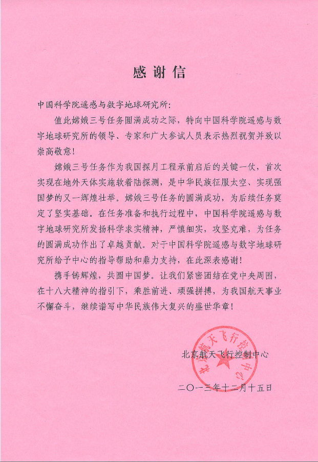 2013年12月15日,嫦娥三号任务圆满成功。北京航天飞行控制中心向遥感与数字地球研究所发来感谢信,感谢我所嫦娥三号参试人员的辛勤工作和重要贡献,对我所给予的大力支持表示衷心感谢。