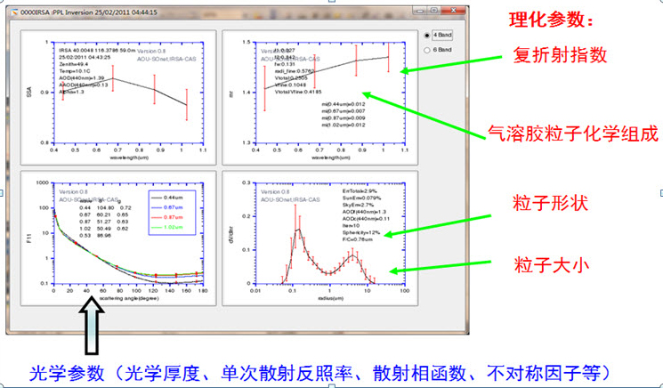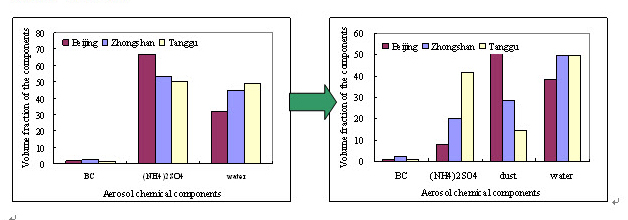 在气溶胶化学组成反演方面,形成了针对气候变化研究的气溶胶化学组分反演方案。基于这个新方案,首次通过遥感手段获得了北京地区气溶胶化学成分月变化信息。所获得的气溶胶化学成分信息(碳、硫、水、沙尘含量)为准确估计气溶胶的气候效应及其对全球变化的影响提供了宝贵资料。未来,这种方法还可能扩展到卫星观测领域,为基于观测的气溶胶气候效应评估提供关键支撑。