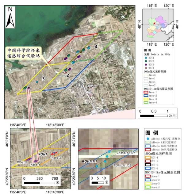 针对官厅水库周边主要地表类型,选择农田、林地、湿地、草地、沙漠、水体以及混合地表下垫面开展了星-机-地多尺度综合观测试验设计,发展了一套可同时捕捉不同尺度地表关键参量时空异质性的地面优化采样方案,可支持1000米、500米、50米、16米、8米、4米的不同尺度观测需求,形成了地基、无人机、有人机、卫星等多平台多尺度观测方案。