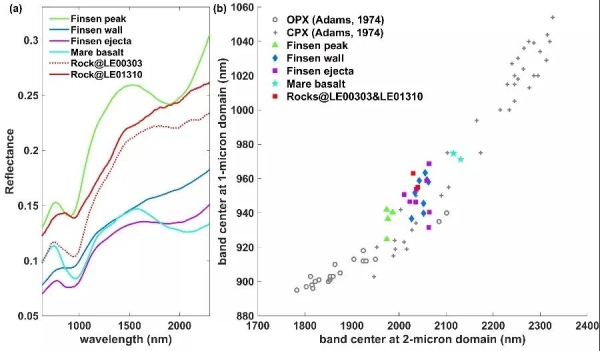 中国科学院空天信息创新研究院遥感科学国家重点实验室科研人员通过系统分析嫦娥四号获取的探测数据,取得一系列有关着陆区矿物成分、地形地质演化历史、月壤太空风化程度和浅层地下结构等方面的科学成果。近日,该团队的研究成果发表在国际期刊《Journal of Geophysical Reasearch:Planets》。科研团队通过分析巡视区石块的光谱特征,推断石块很可能源自古老的芬森撞击坑,空间分布特征表明它们是新鲜出露的撞击坑溅射物。这些石块由芬森撞击坑溅射过来后原本埋藏在月壤之中,后期由于织女撞击坑溅射物的撞击挖掘作用而暴露在月表。