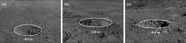 已有研究结果显示,位于着陆区西北方向的织女撞击坑的一条溅射纹恰好穿过了着陆点附近区域,而溅射纹内常常可见由溅射物形成的二次撞击坑。“玉兔二号”巡视区确实还能观察到若干个内部和周边均存在碎块状物质的米级和亚米级的新鲜撞击坑(图 5)。结合椭圆撞击坑的长轴方向推断,这些新鲜撞击坑应当为织女撞击坑溅射物形成的二次撞击坑。