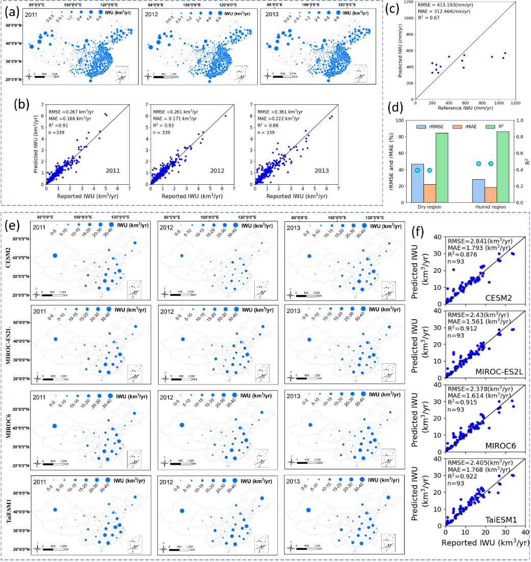 现有的灌溉用水估算方法,受到数据可用性和模型结构的约束,在全国尺度和未来气候变化情景下适用性差。基于此,该研究团队开发了一个基于机器学习的新模型,通过整合一系列高精度水文要素卫星遥感产品(降水、蒸散、土壤水分和雪水当量)、气象驱动因子、经济统计数据和数值模型模拟,在数据驱动框架下估算全国尺度的灌溉用水。新模型在估算灌溉用水方面表现出较高的准确性。通过11个农田站点的独立观测验证,模拟数据与实地观测数据具有显著相关性,准确率达到90%以上。