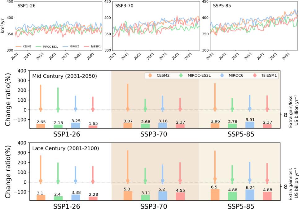 该研究团队进一步考虑了一系列气候和社会经济情景,将建立的机器学习框架与四个先进的地球系统模型结合,提供了未来70年中国灌溉用水的变化趋势和相关成本。研究发现,基于不同的温室气体排放情景,未来70年,约60%的省份的灌溉用水量都会增加,特别是西北和华北区域。对比20世纪80年代至2010年的数据,全国灌溉用水到2050年预计最高将增加17.1%,灌溉用水的增加带来每年新增成本最高达到39.1亿美元;到2100年预计最高将增加34.8%,每年新增成本最高达到65亿美元,研究结果突显了水资源可持续利用与管理的迫切性。