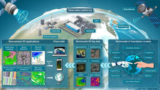 系统利用不同观测平台,获取多模态遥感大数据,开发多模态AI大模型,充分利用各种模态数据,适配于各种地学应用,进一步应用到实际用户端,用户的使用结果可反馈到载荷和平台的验证和设计,实现一个可循环的全链路反馈机制。