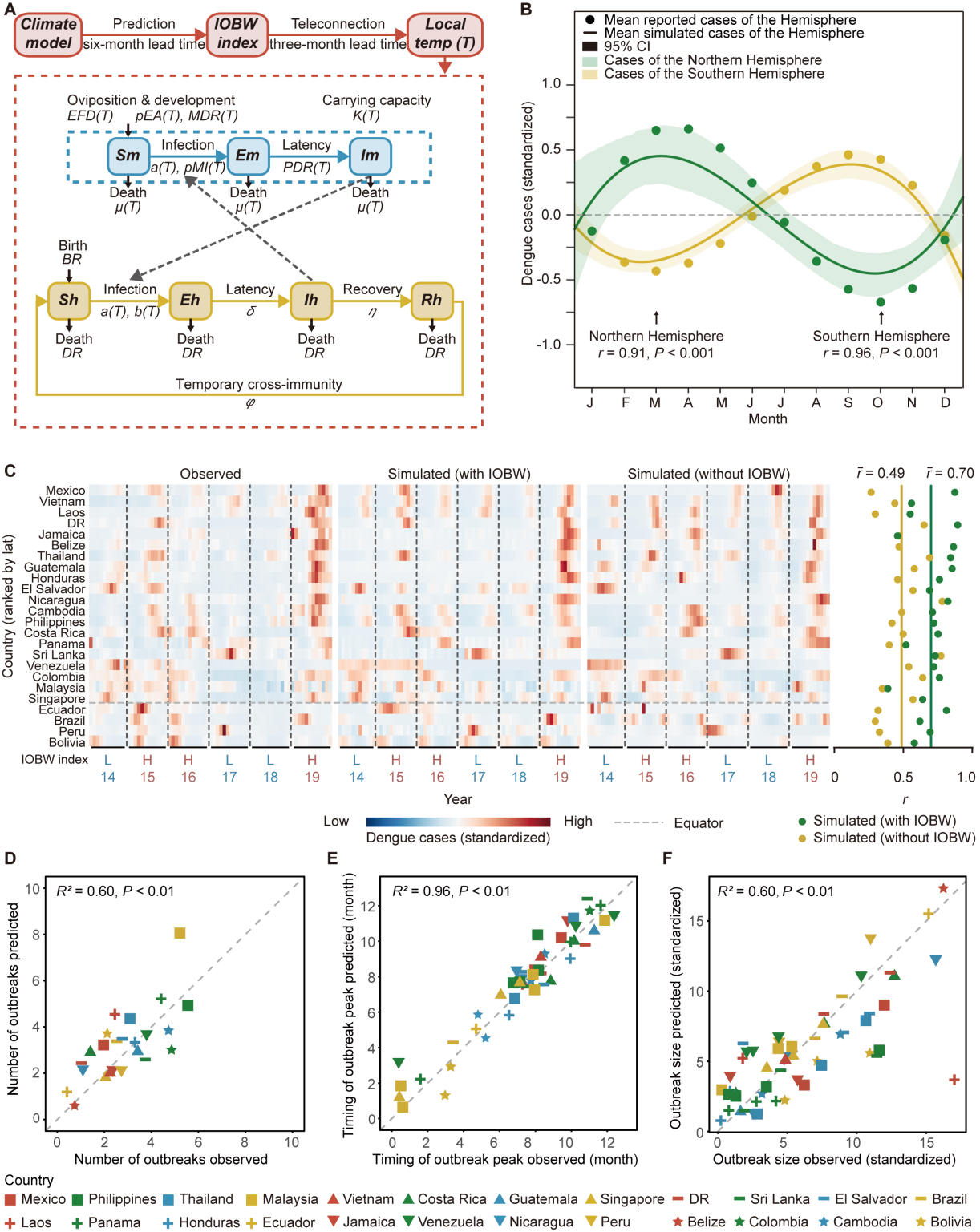 IOBW指数可作为预测全球登革热流行年际和季节规模的指标。IOBW指数是热带印度洋海表温度(SST)异常的区域平均值,以全海域变暖或变冷为特征,是热带印度洋变率的最主要模态。研究团队发现过去30年间(1990-2019)南、北半球的登革热发病率和IOBW指数表现出一致的长期趋势(图1A)。同时,登革热流行季前一季度气候指数与南、北半球登革热月发病率均相关,具体表现为:当IOBW指数为正(负)值时,登革热月发病率偏高(低)(图1B)。团队还进一步测试结果的特异性,发现在30个全球气候指数中,IOBW指数与南、北半球登革热年发病率呈现最密切的相关性,且南、北半球的关联性基本一致(图1C、图1D)。上述发现表明,登革热规律性的年际和季节波动可能受到全球气候模态之一的热带印度洋全区海温一致变化模态的统一影响。