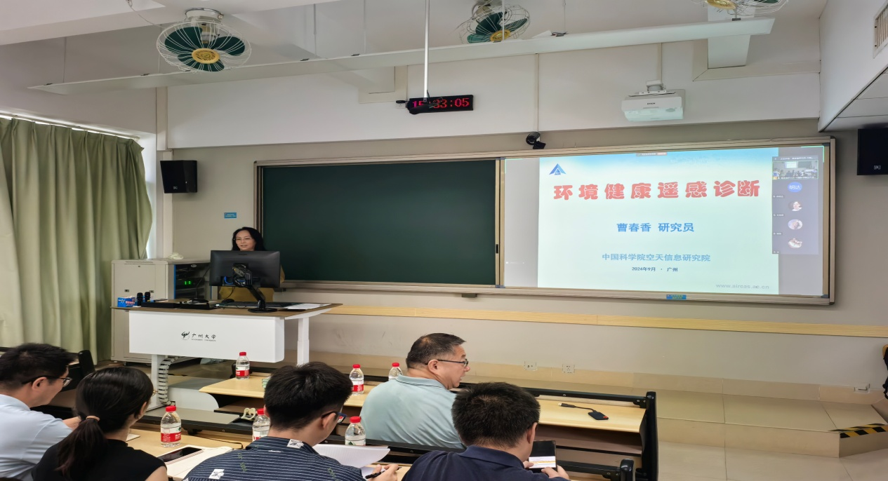 会议期间,环境健康遥感大数据团队成员还受邀到广州大学地理科学与遥感学院和深圳大学进行了深入交流。曹春香给师生们做了“环境健康遥感诊断”讲座(图4),王少华在地理信息、空间优化及联合试验等方面与广州大学地理科学与遥感学院达成了长期合作的意向。