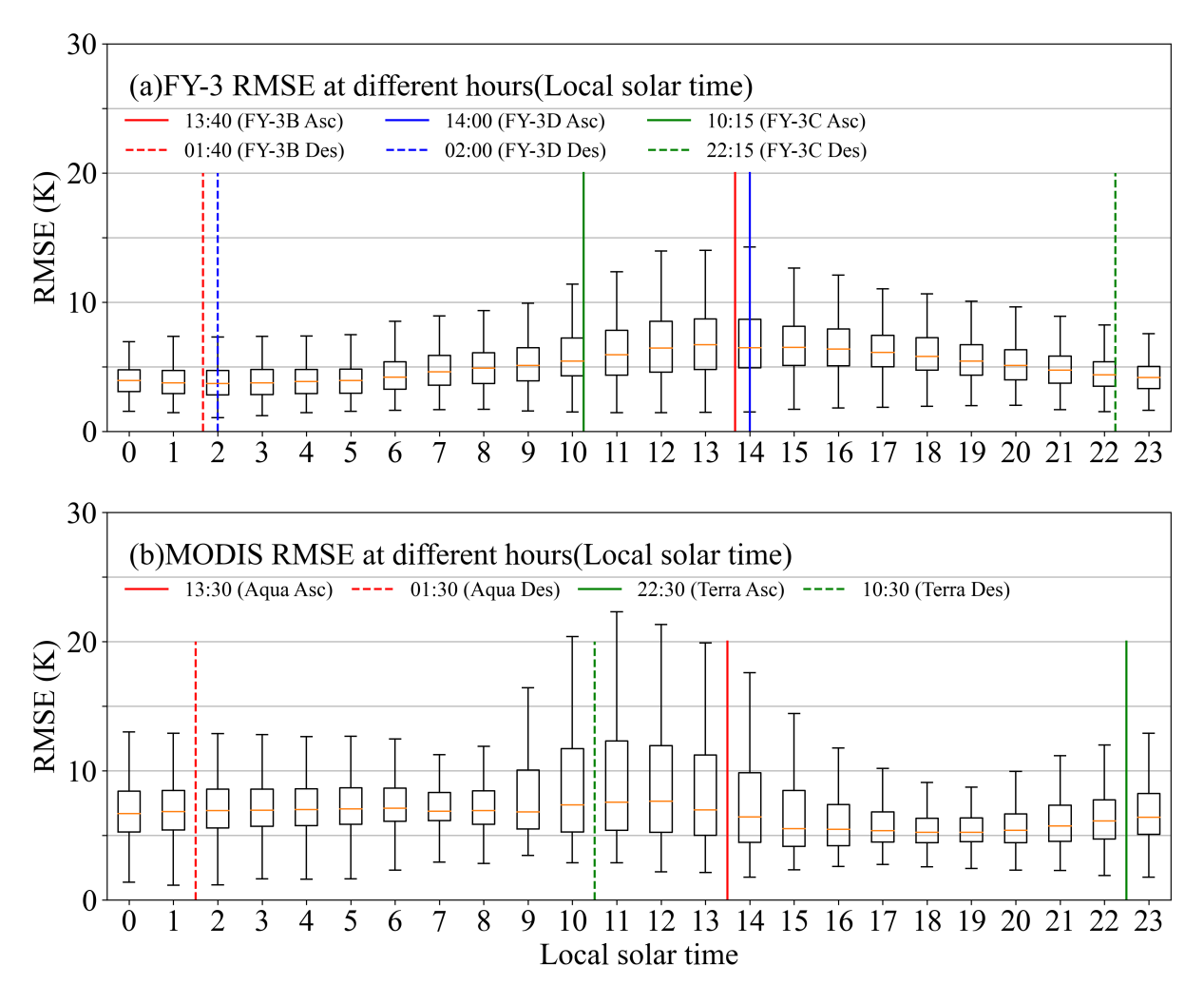 相对于单颗卫星每日1-2次的观测,风云三号B/C/D通过三星组网的多轨道协同观测,显著提升了地表温度日变化特征的捕捉能力。具体而言,该系统在10:15、13:40、14:00(日间)和22:15、01:40、02:00(夜间)等关键时段实现了日内高频次观测。基于地面验证站网的评估结果表明:风云卫星三星协同观测数据构建的地表温度日循环模型,其24个整点时刻的温度重建均方根误差仅为5.2 K,显著低于MODIS的每日四次观测系统。这一能力为陆面过程模型中的地表热通量估算和能量平衡研究提供了更可靠的数据支持。
