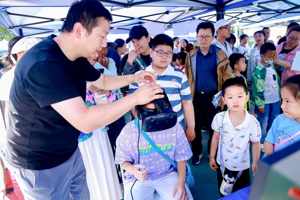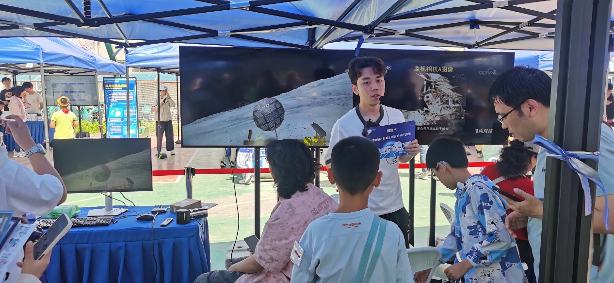 “智绘月图-行星遥感成果”展区展示了实验室参与嫦娥六号任务的一系列成果和其他代表性科研成果。为公众带来了“巡视月球VR体验系统“,该系统融合了先进的VR技术、体感交互功能和精准的三维建模技术。在现场,小朋友们热情高涨,聚精会神聆听实验室人员讲解着陆器和巡视器的工作奥秘,戴上VR眼镜,瞬间“登陆”月球表面,亲身体验操控月球车月面巡视探测过程,在沉浸式互动中感受月球背面的神秘环境。该展区还展示了深空探测实验平台设备,并详细介绍了其先进的环境感知、导航定位以及避障功能;精心组织了 “月球小百科”有奖知识问答活动,通过这种趣味性十足的互动方式,公众对月球的认知变得更加直观和深刻;为了鼓励大家积极参与,活动现场还特地准备了红蓝立体卡片等精美奖品,深受观众喜爱。