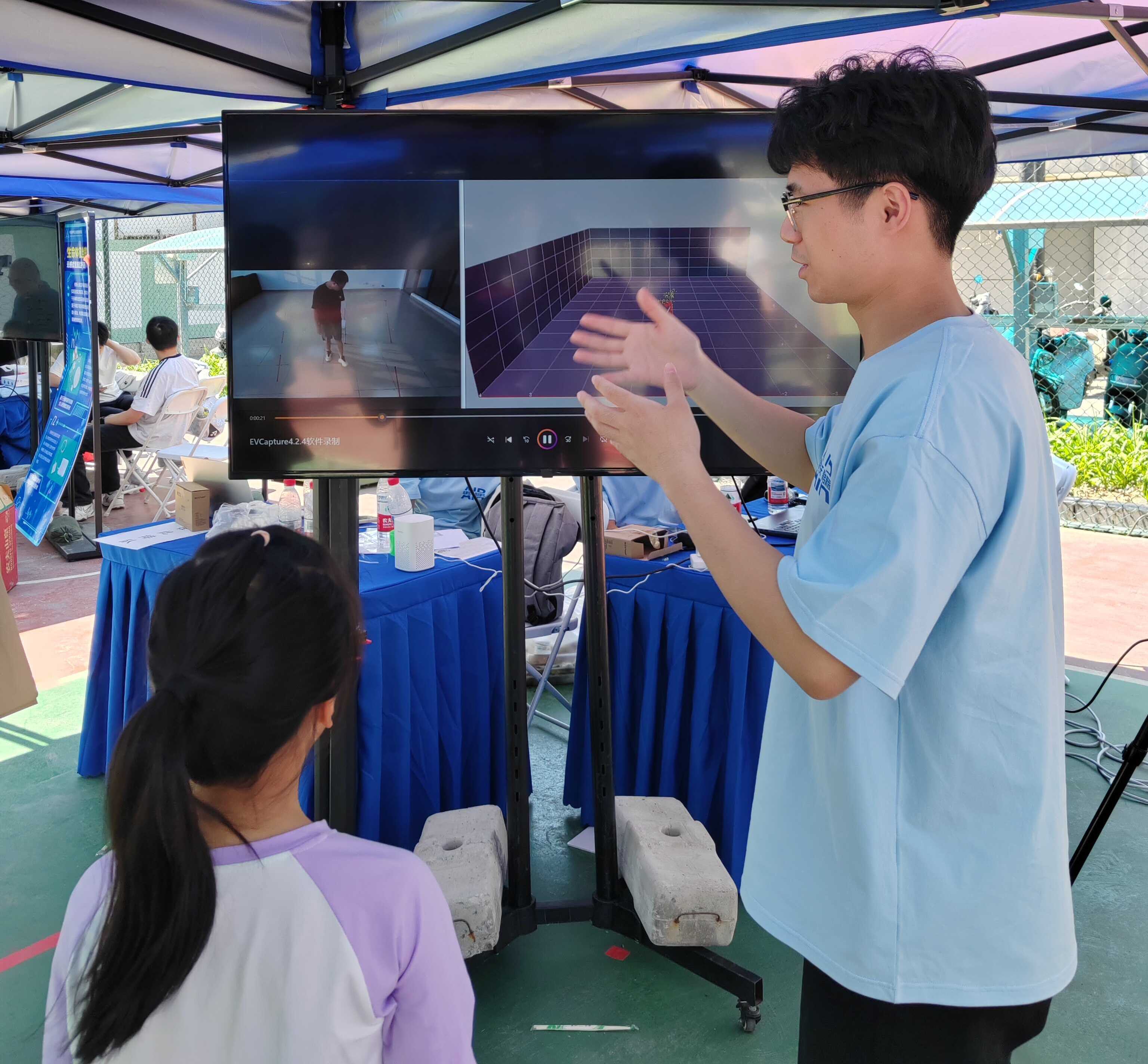 “灵犀动影--人体姿态估计雷达”展区推出“灵犀动影”毫米波雷达系统,该系统具备高分辨、低成本和隐私保护性。结合人工智能,可实现室内人体跟踪和姿态估计,为智能生活提供强有力的技术支撑。现场家长带着孩子们围绕展板认真聆听讲解员的介绍并亲身体验位置追踪和姿态捕捉,对毫米波雷达的工作原理和应用场景表现出浓厚的兴趣。