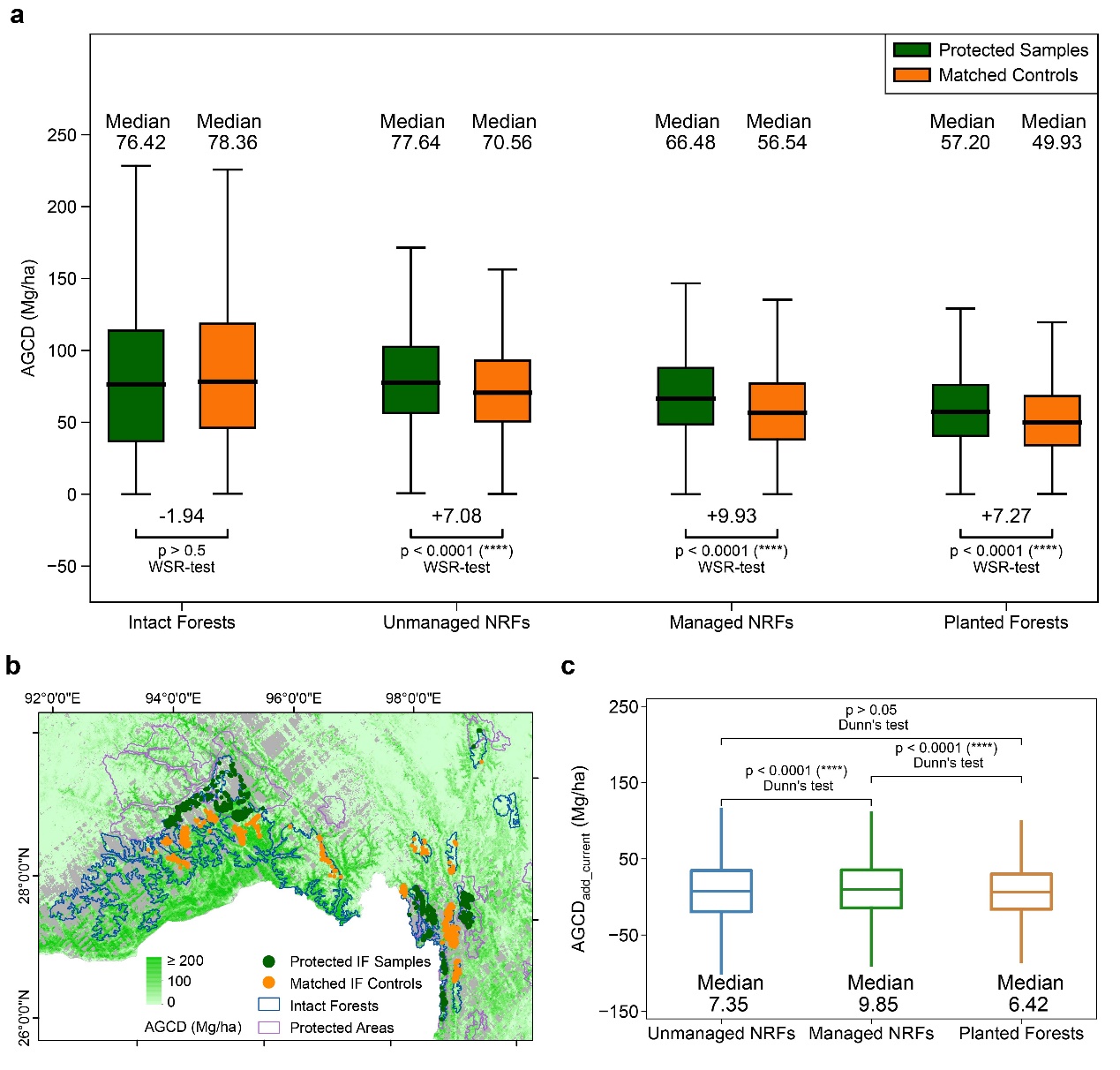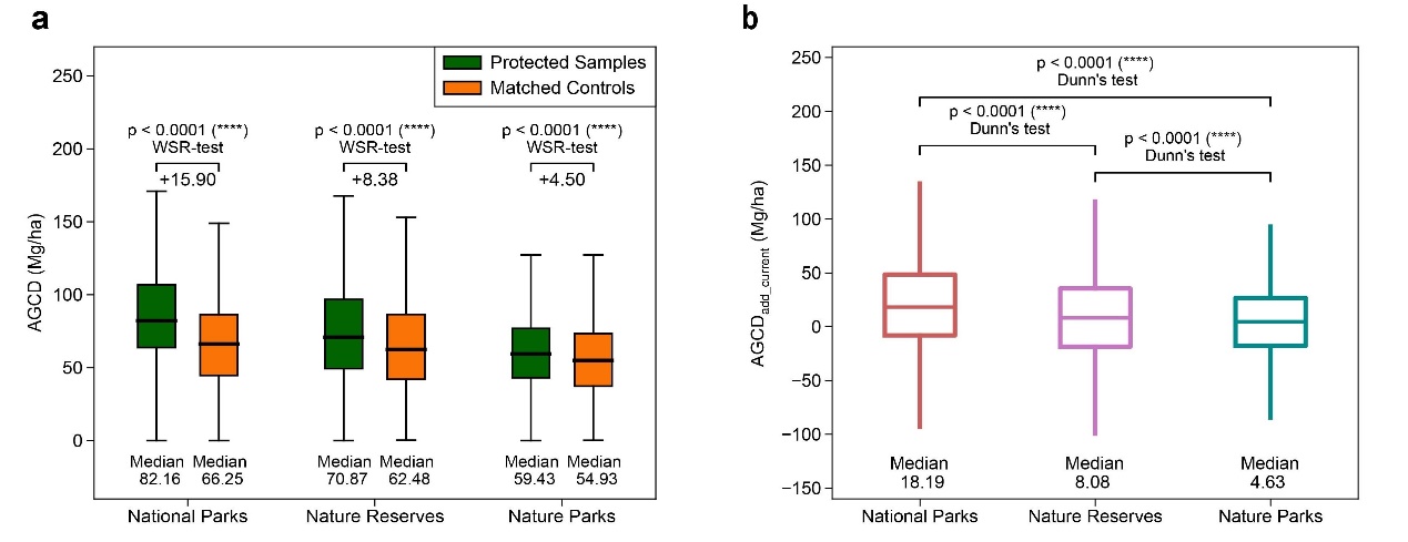 研究表明,我国自然保护地整体上显著提升了森林碳储量,但不同保护等级和管理类型之间差异明显。其中,国家公园和受良好管理的天然再生林表现出最为突出的碳汇增益优势;保护强度越高,森林固碳潜力越大。在高排放情景(SSP5-8.5)下,若实施更加严格的保护措施,到2100年我国自然保护地有望额外增加约600 Tg森林碳储量,大致相当于我国2023年化石燃料与工业碳排放量的19%,这一增量也接近过去三十年我国人工林扩张所实现的碳储量。
