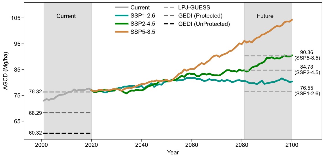 近日,中国科学院空天信息创新研究院遥感与数字地球全国重点实验室联合可持续发展大数据国际研究中心和丹麦奥胡斯大学,创新性地融合星载激光雷达GEDI观测数据与动态植被模型LPJ-GUESS模拟结果,在全国尺度系统评估了我国不同类型自然保护地对森林碳密度的保护成效,并预测了未来不同气候情景和保护强度下的碳汇增益潜力。